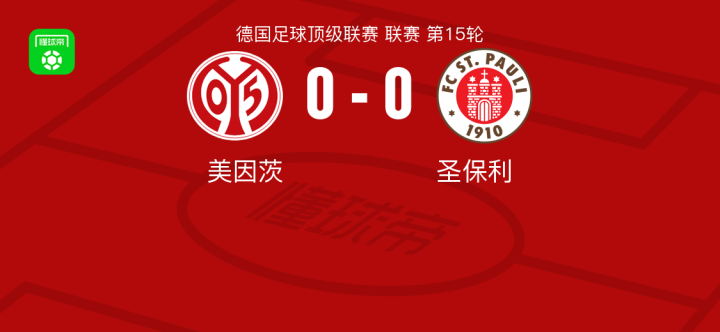 北京时间12月21日德国足球顶级联赛 联赛 第15轮,美因茨主场对阵圣保利。最终比分美因茨 0-0 圣保利。