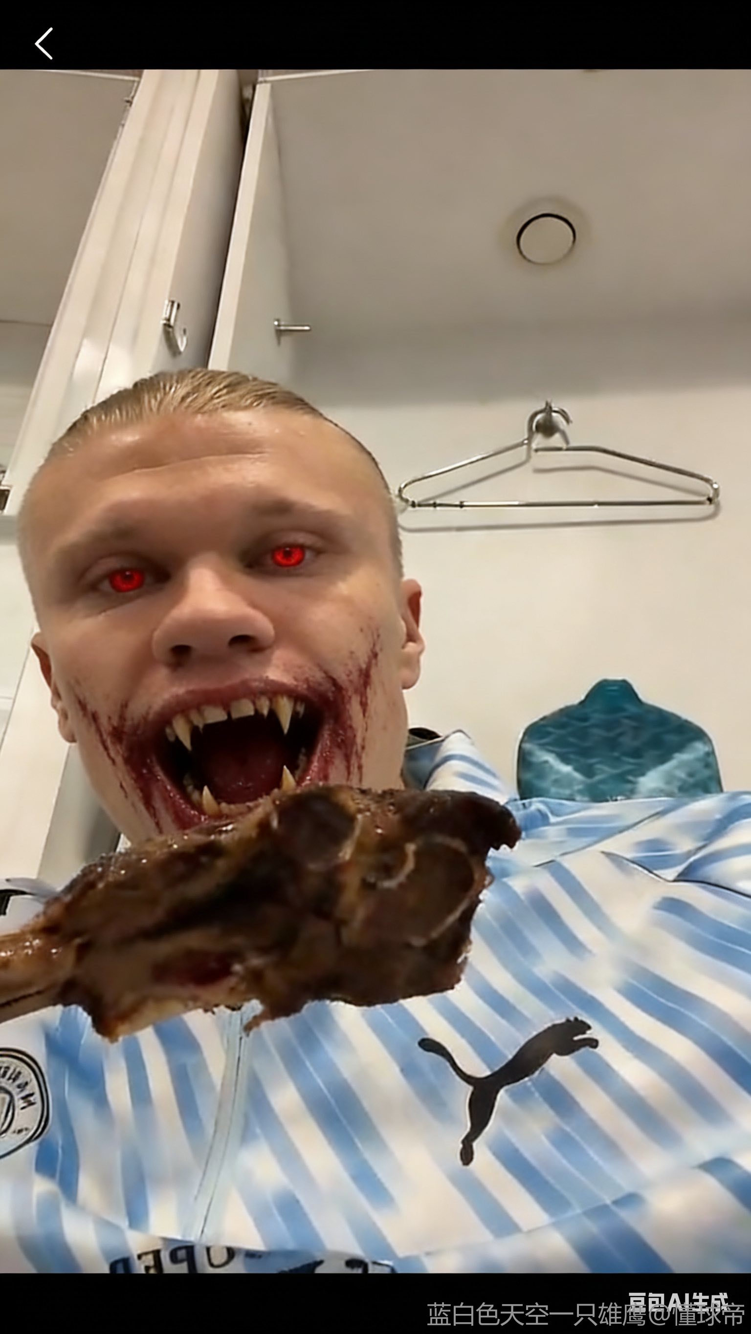 扫描下载懂球帝首页>动态> 哈兰德晒赛后补充蛋白质:在更衣室手拿牛排大口吃肉