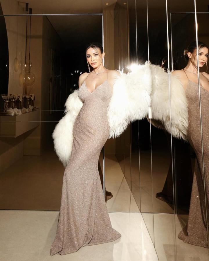 扫描下载懂球帝首页>动态> 卡里乌斯妻子晒圣诞写真:身穿金色深V礼服展示孕肚