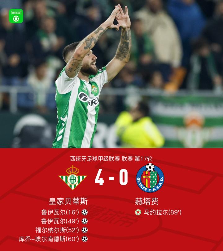 12-22 04:00西甲第17轮:皇家贝蒂斯4-0赫塔费,鲁伊瓦尔双响