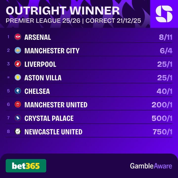 扫描下载懂球帝首页>动态> 英超夺冠赔率:阿森纳、曼城前二,维拉升至并列第三