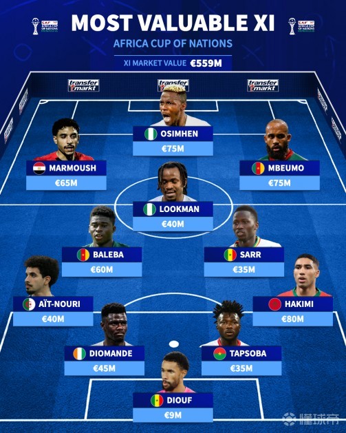 扫描下载懂球帝首页>动态> 德转列非洲杯最贵11人阵容:阿什拉夫、奥斯梅恩、姆伯莫领衔