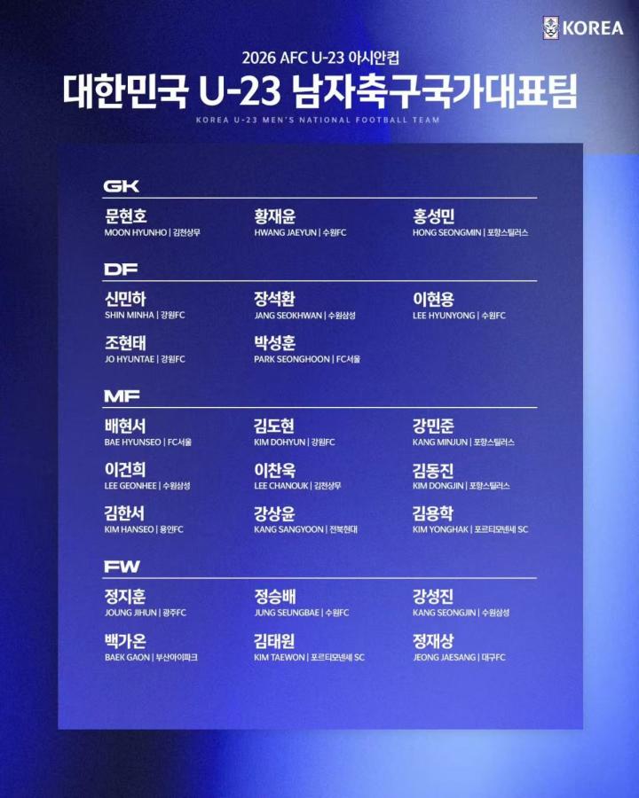 从年龄构成来看,2003年出生的球员有11名,2004年出生的有6名,其中有5名(文炫浩、金龙鹤、姜尚润、李燦煜、姜成真)是2023年阿根廷U20世界杯四强成员。此外,加上今年10月在智利举行的U20世界杯上参赛的4名2005年出生球员(金泰元、裴炫瑞、申敏河、李建熙)以及2名2006年出生球员(白佳温、洪成民),组成了本次名单。此次旅欧派,只是征召了在葡甲波尔蒂芒人的两名球员金龙鹤和金泰元,而其他适龄球员包括裴俊浩、梁民革等在英国舞台效力的球员,均无缘大名单。