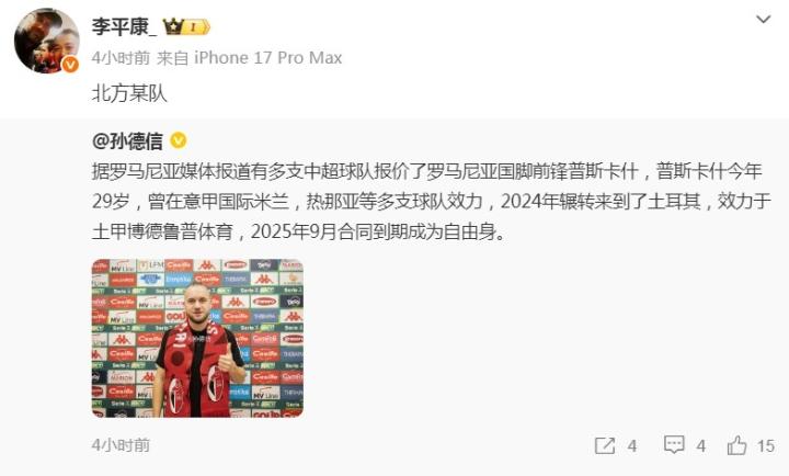 另一方面,针对有关中超球队报价罗马尼亚前锋普斯卡什的传闻,媒体人李平康透露:“(是)北方某队。”