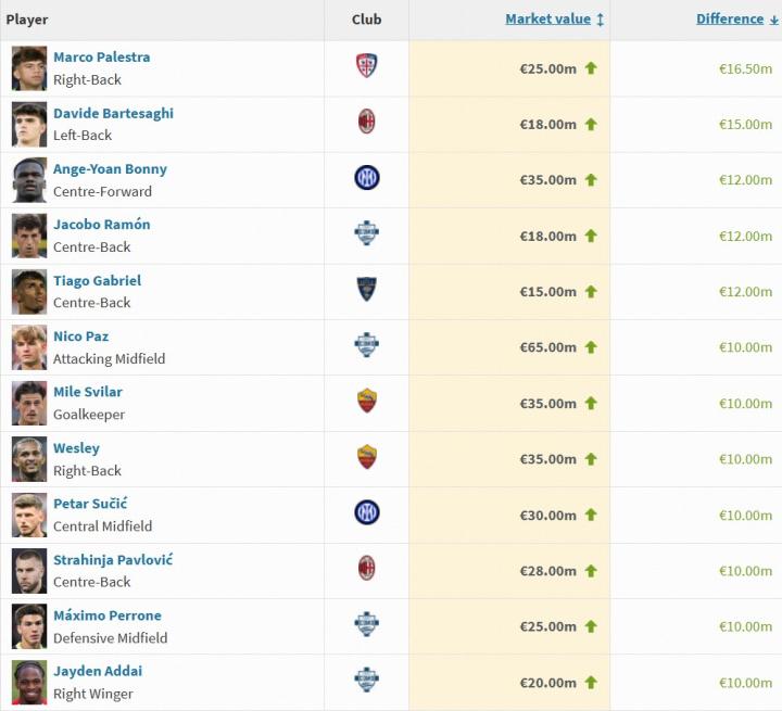 12-23 21:15德转意甲身价涨幅榜:帕莱斯特拉+1650万,巴尔泰萨吉+1500万