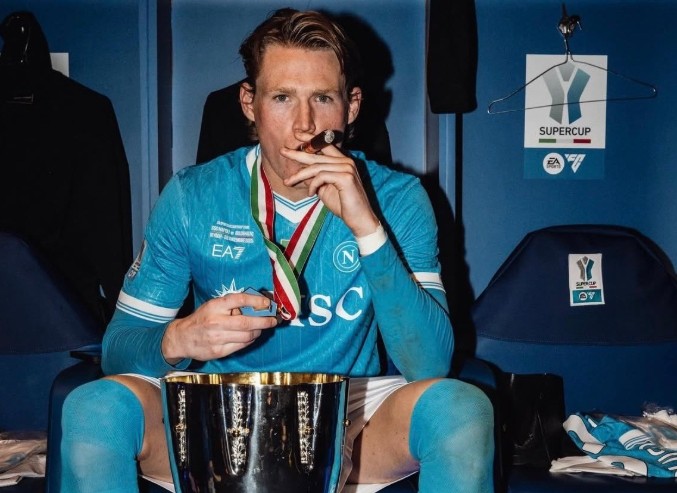 12-23 20:00意超杯夺冠后,麦克托米奈和队友在更衣室里抽雪茄庆祝