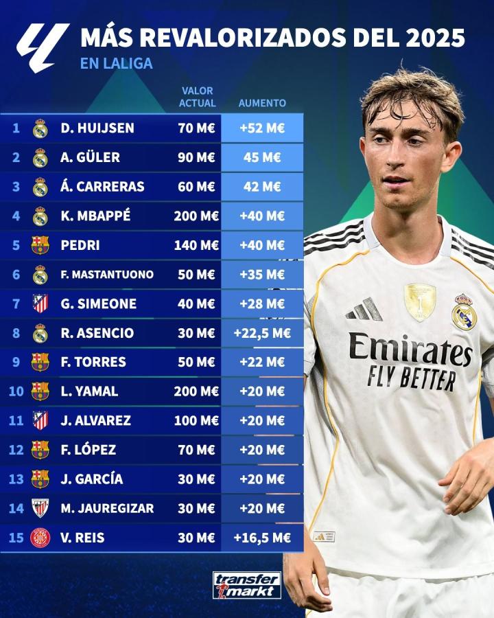 扫描下载懂球帝首页>动态> 西甲2025年身价涨幅TOP15:赫伊森上涨5200万第1,姆巴佩第4