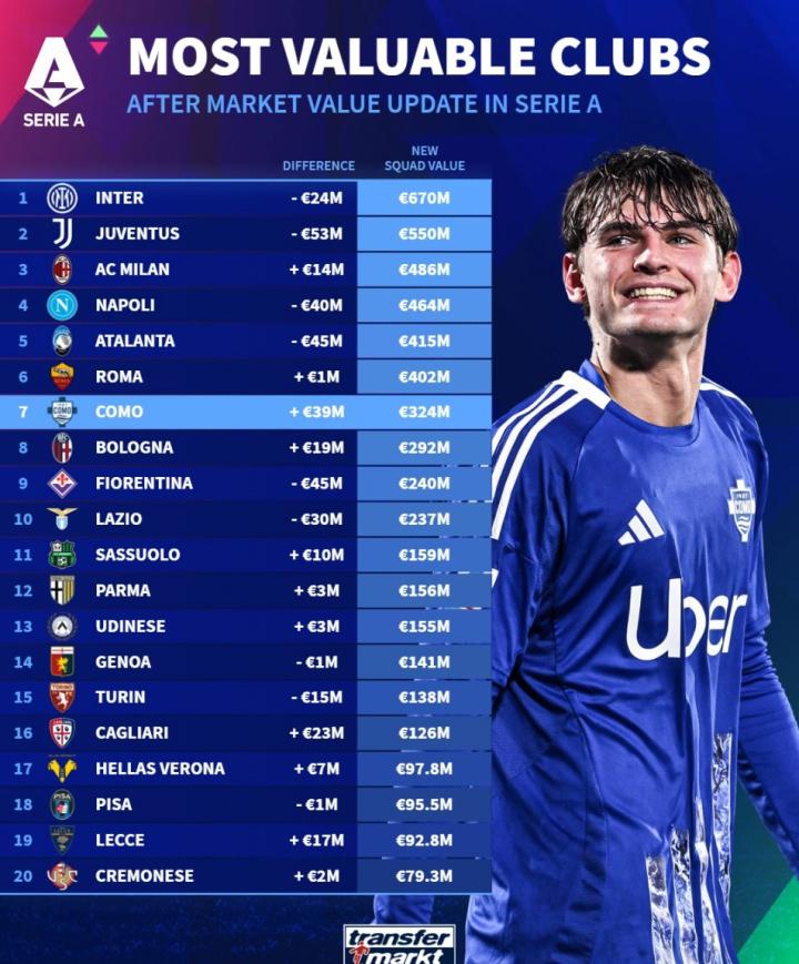 扫描下载懂球帝首页>动态> 德转列意甲俱乐部身价排名:国米6.7亿欧第一,尤文5.5亿第二