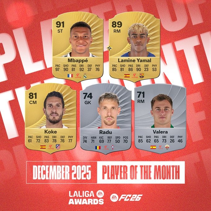 扫描下载懂球帝首页>动态> 西甲12月最佳球员候选:姆巴佩、亚马尔、科克、拉杜、巴莱拉
