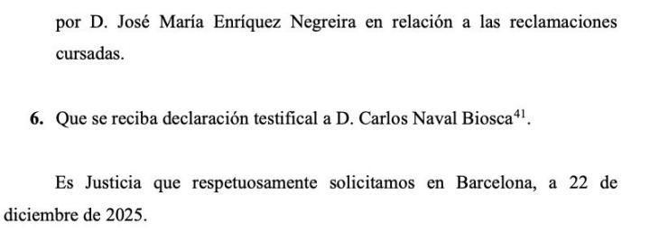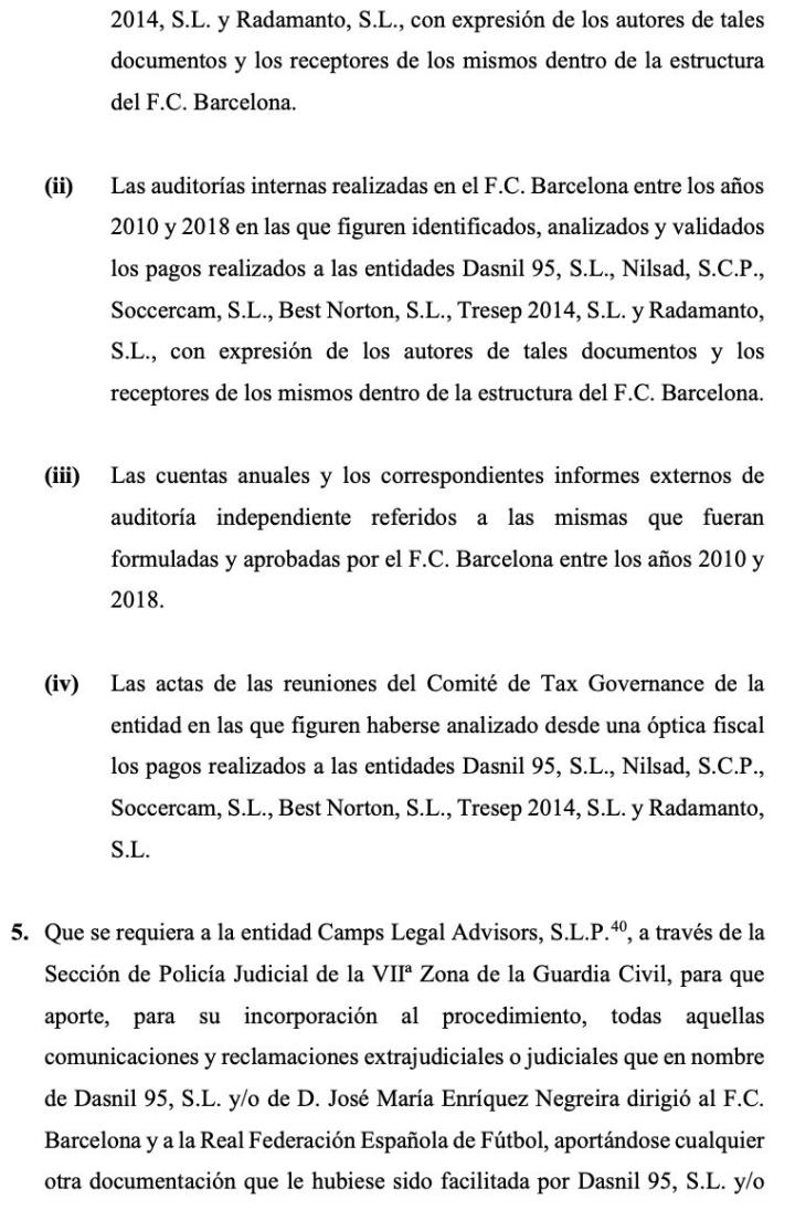 5.要求 Camps Legal Advisors, S.L.P 公司,通过西班牙国家警察第七区刑事警察部门,提供其将提交至诉讼程序的所有以Dasnil 95, S.L.和/内格雷拉先生名义向巴塞罗那足球队和西班牙足球皇家联合会发出的司法或非司法通信和索赔,并提供Dasnil 95, S.L.和/或内格雷拉先生提供的任何其他与索赔相关的文件。