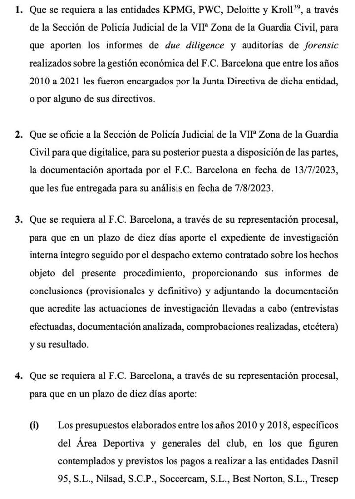 1.要求通过内政部第七区警察司法部门,向KPMG、PWC、德勤和Kroll³⁹等机构索取它们在2010年至2021年间受巴塞罗那足球俱乐部董事会或其任何高管委托,对俱乐部经济管理进行的尽职调查和法证审计报告。