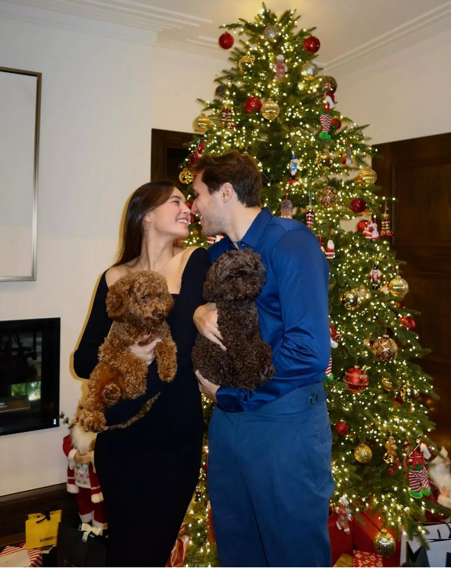 去年圣诞,他们晒出与两只爱犬在圣诞树前的甜蜜合影,照片中身着睡衣的二人深情对望,温馨满溢。