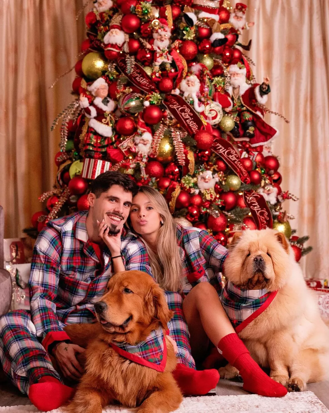 去年圣诞,卡罗莱娜分享了一张充满家庭温暖的合照:二人身着经典格子睡衣,与同样戴着同款格子领巾的爱犬们在圣诞树前合影,树上挂满了传统装饰,节日气息浓厚。