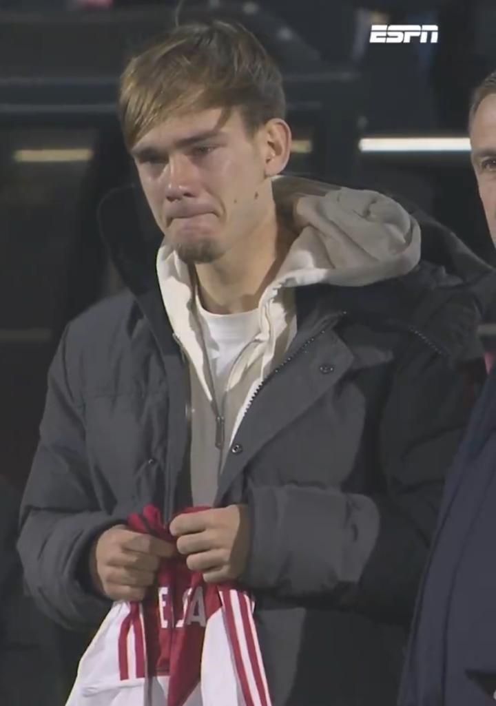 本场比赛,阿贾克斯二队全体球员佩戴黑色臂章出场。开球哨响前,现场举行了一分钟默哀仪式,全场陷入沉寂。站在队列中的费尔库伊尔神情凝重,他看着印有女友名字的球衣,难掩悲痛,潸然泪下。他将印有女友名字的球衣放在球场中央,队友陪伴在他身旁给予他鼓励与安慰。