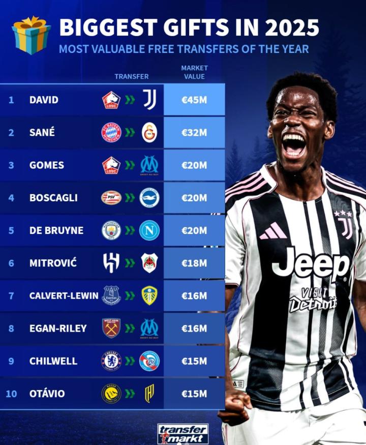 扫描下载懂球帝首页>动态> 德转列2025年免签球员身价榜:戴维4500万第1,萨内3200万第2