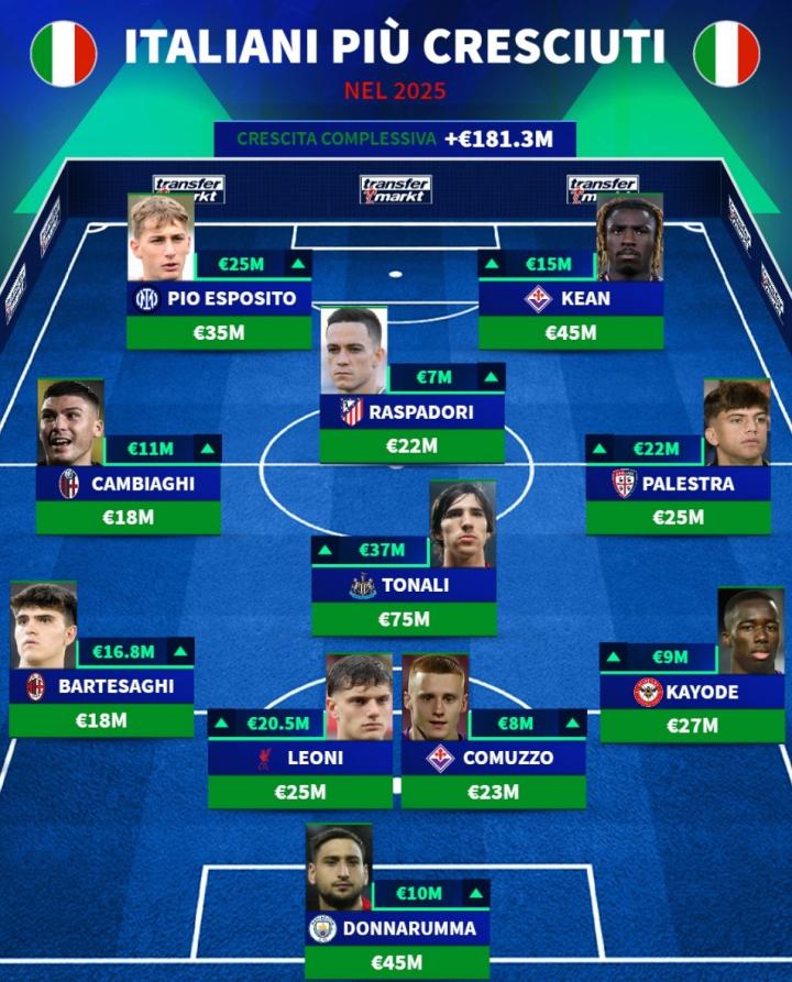扫描下载懂球帝首页>动态> 德转列2025年意大利球员身价上涨最佳11人:托纳利、皮奥在列