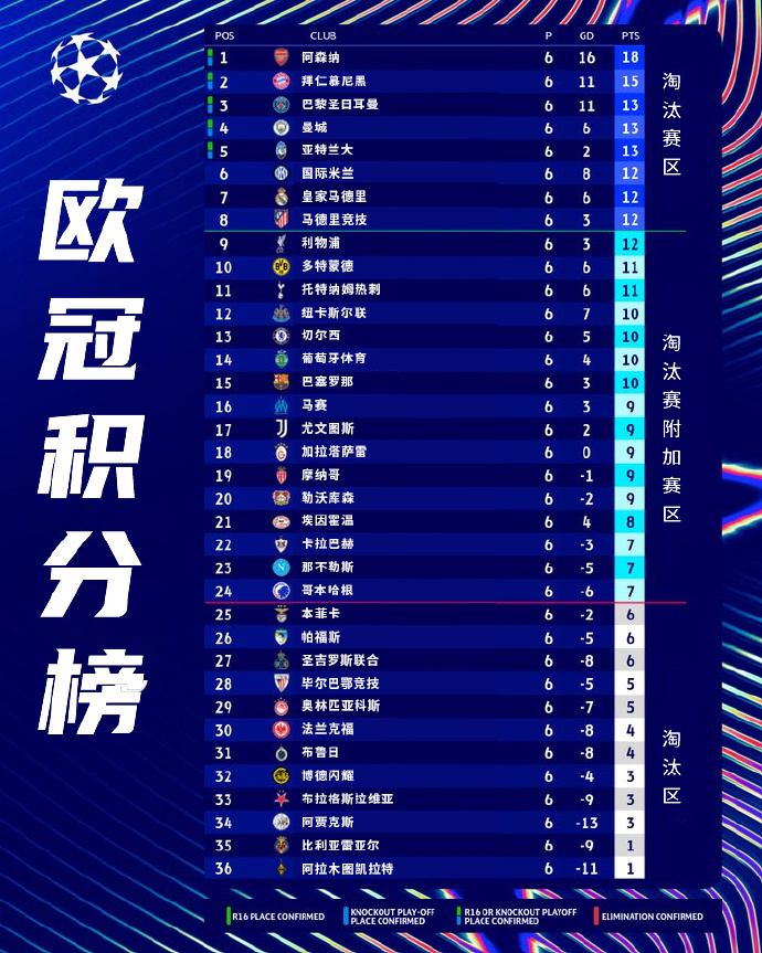 曼城则是拿到13分,排在积分榜第4;利物浦则是和马德里双雄同积12分,但由于净胜球劣势排在第9;热刺11分,纽卡斯尔与切尔西也是各积10分。英超四支不在积分榜前8的队伍,距离直接出线区的差距也是一个胜场以内。