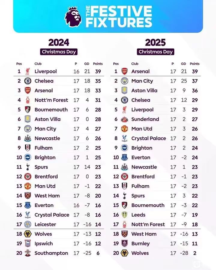 扫描下载懂球帝首页>动态> 懂球号> 回顾英超上个赛季的圣诞排行榜: