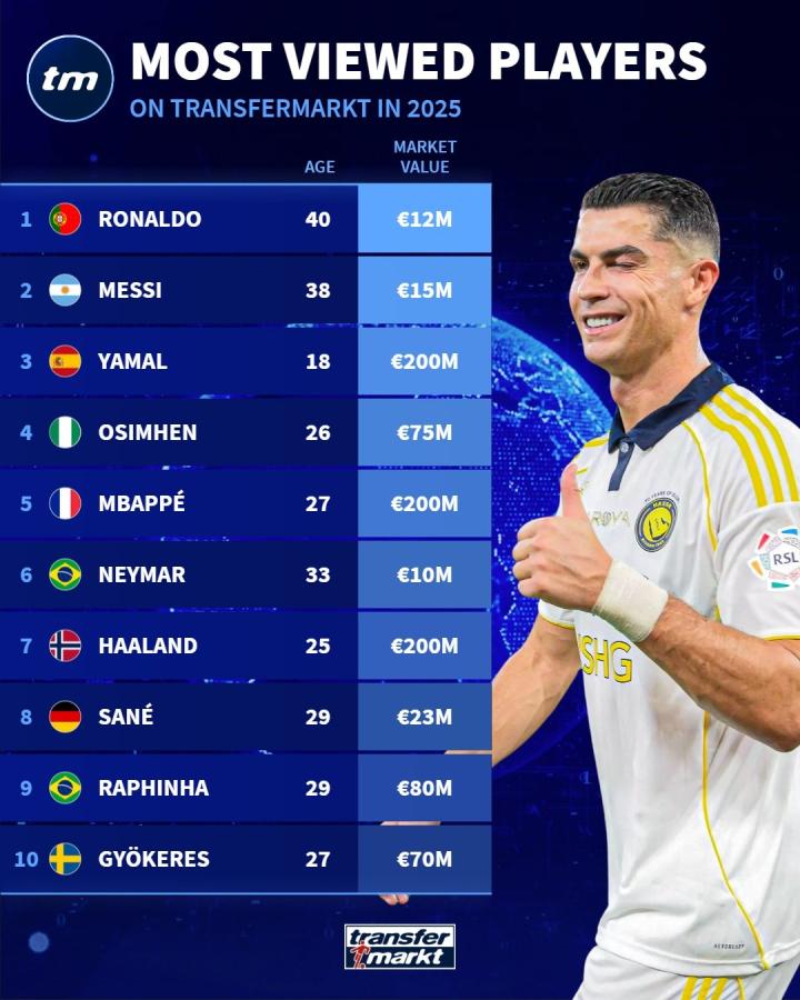 扫描下载懂球帝首页>动态> 德转2025年度球员浏览量排名:C罗第1,梅西第2,亚马尔第3