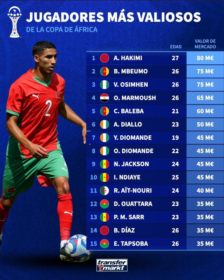 扫描下载懂球帝首页>动态> 非洲杯球员身价榜:阿什拉夫8000万第1,姆伯莫、奥斯梅恩第2