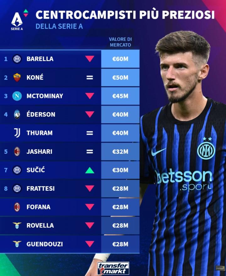 扫描下载懂球帝首页>动态> 德转意甲中场身价前10:巴雷拉6000万第1,科内,小麦二三位