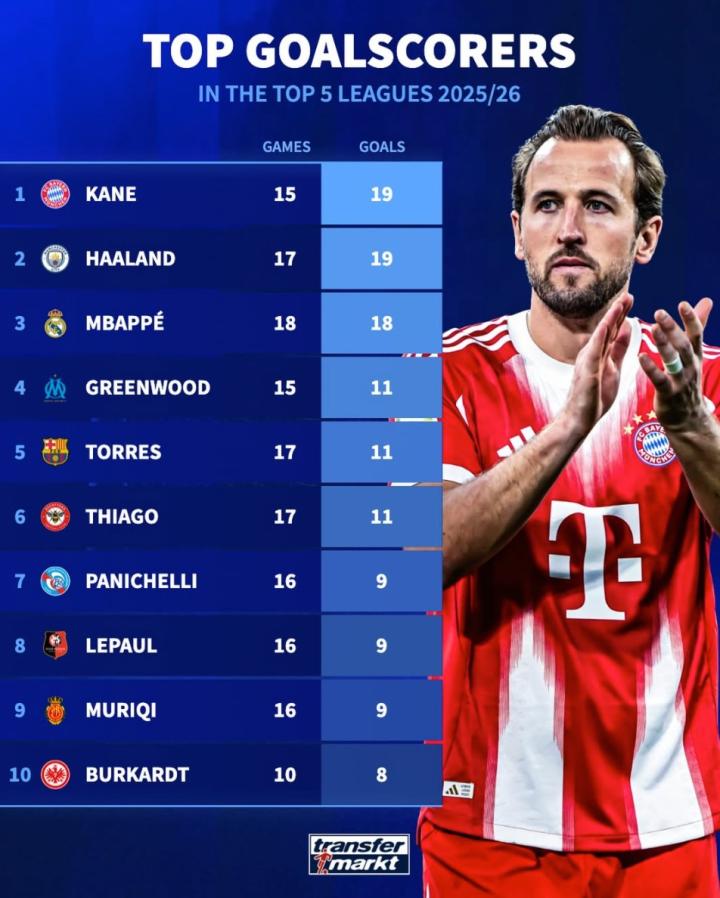 扫描下载懂球帝首页>动态> 本赛季五大联赛射手榜:凯恩、哈兰德19球第1,姆巴佩18球