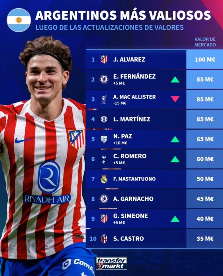 扫描下载懂球帝首页>动态> 阿根廷球员身价:小蜘蛛1亿欧居首,恩佐、麦卡、劳塔罗8500万