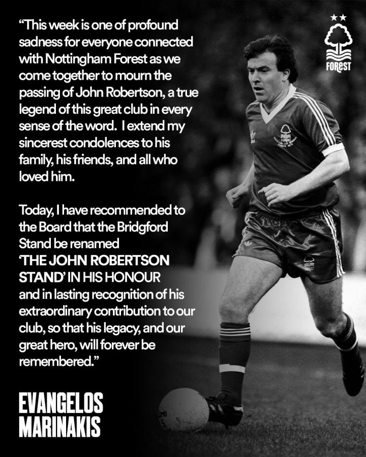 扫描下载懂球帝首页>动态> 为纪念俱乐部传奇,森林老板已提议用罗伯逊名字命名看台