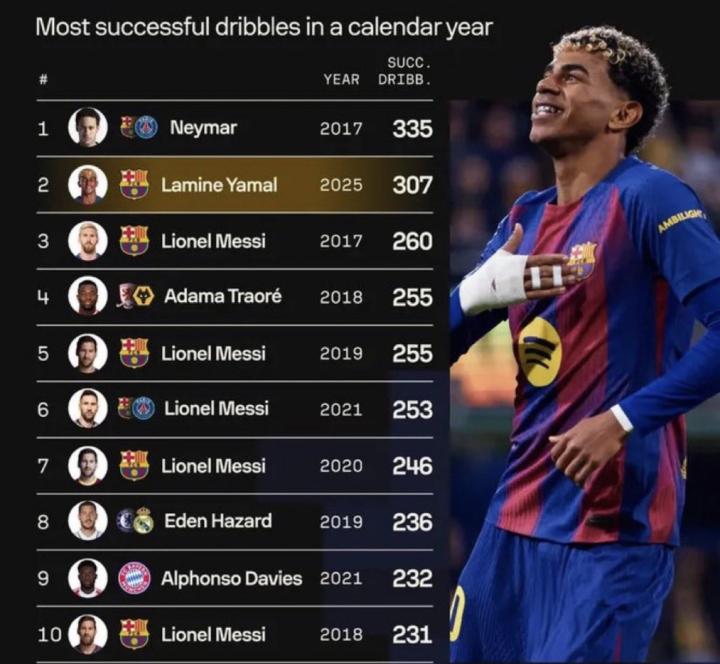 扫描下载懂球帝首页>动态> 懂球号> 五大联赛自然年过人榜:内马尔居首,亚马尔次席,阿...