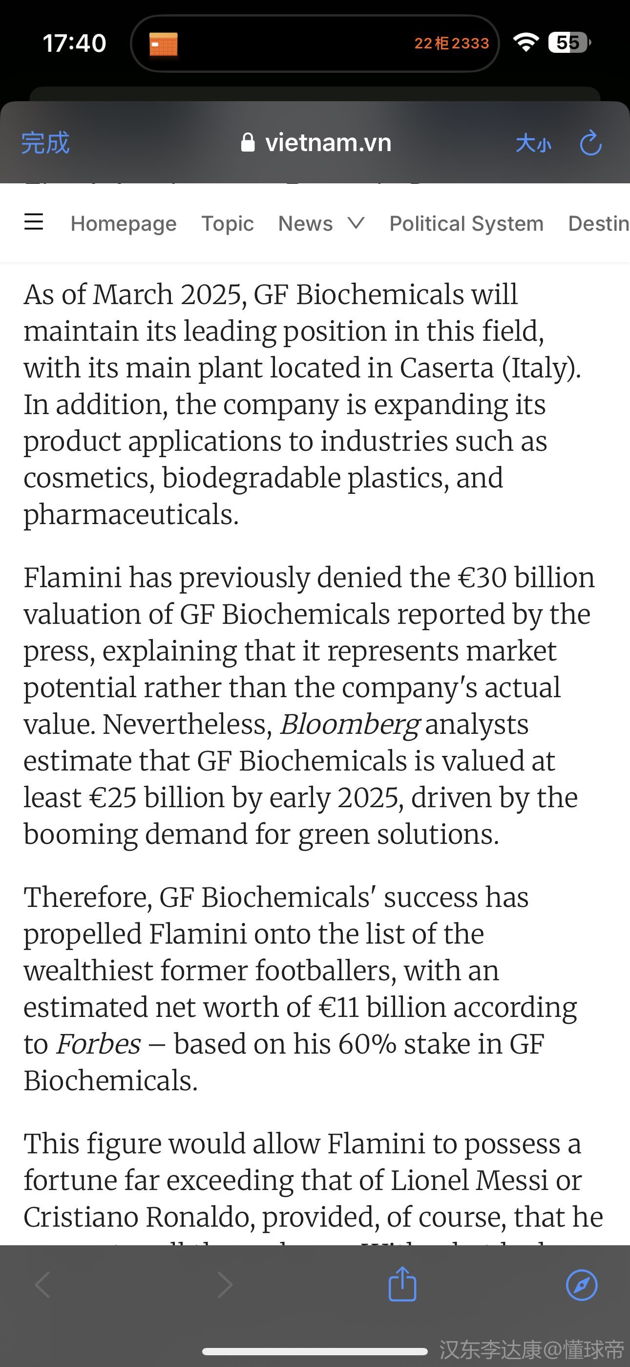 弗拉米尼这个辟谣过很多次了,他虽然确实很有钱,但是他的资产估值在11亿欧左右,百亿是整个市场的潜力估值,不是真实价值