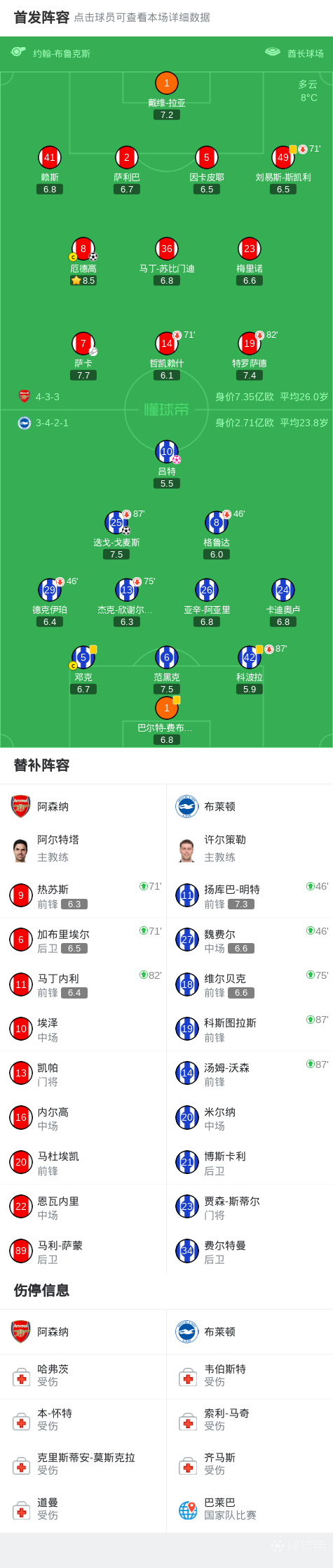 不占优势,阿森纳8次英超主场对布莱顿3胜2平3负