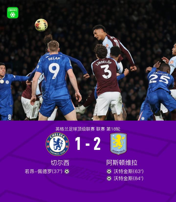 扫描下载懂球帝首页>动态> 剑南春|切尔西1-2维拉,沃特金斯双响,佩德罗破门,马特森逃点