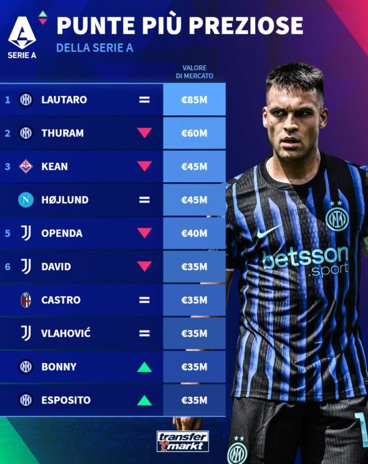 扫描下载懂球帝首页>动态> 德转列意甲中锋身价前10:劳塔罗8500万第1,霍伊伦4500万第3