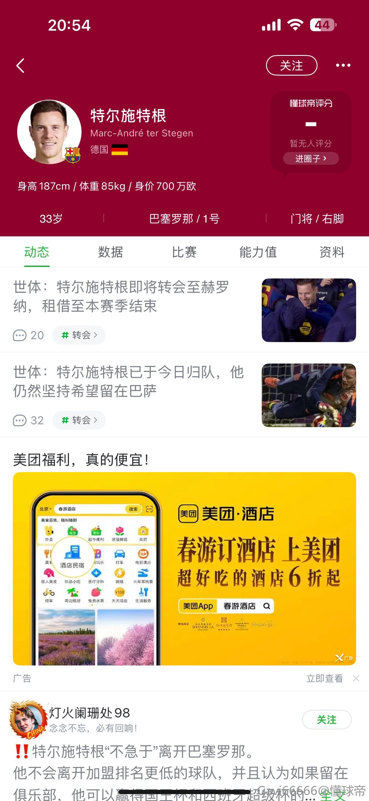 每体:赫罗纳很喜欢特尔施特根,但无法承担球员的高薪