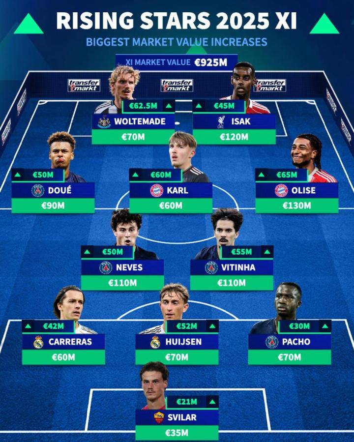 扫描下载懂球帝首页>动态> 德转列2025年身价涨幅最高11人阵容:奥利塞领衔,伊萨克在列