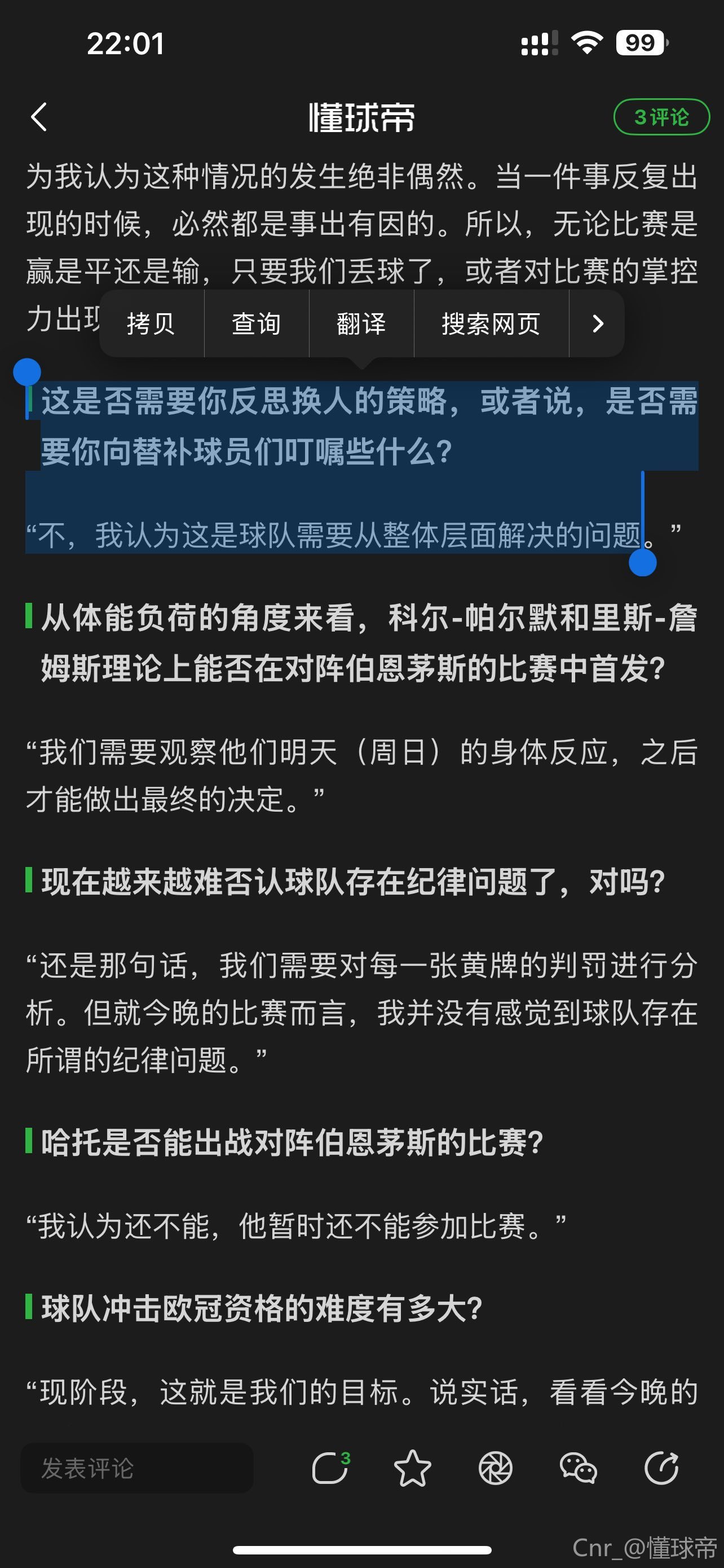 “这个我不太好说。关键是要弄明白背后的原因,因为我认为这种情况的发生绝非偶然。当一件事反复出现的时候,必然都是事出有因的。所以,无论比赛是赢是平还是输,只要我们丢球了,或者对比赛的掌控力出现松动了,就必须找出问题的根源。”
