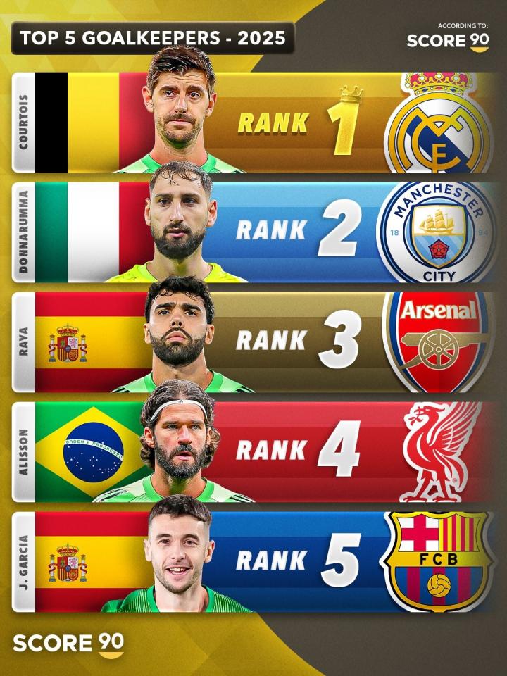 扫描下载懂球帝首页>动态> Score90评2025年五大门将:库尔图瓦居首,多纳鲁马第二