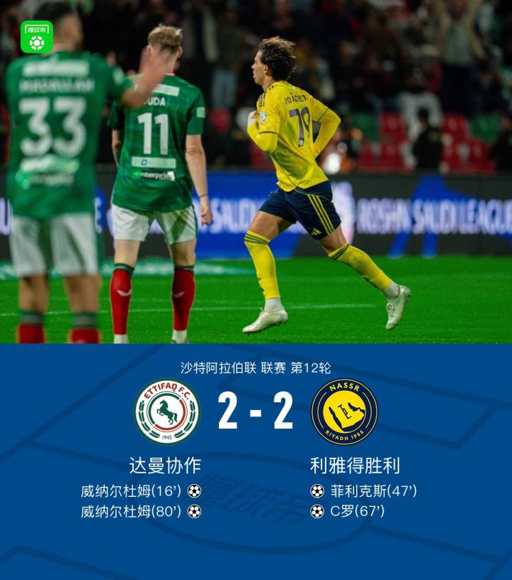 扫描下载懂球帝首页>动态> 利雅得胜利2-2达曼协作,C罗被动破门,菲利克斯传射,杜牧双响