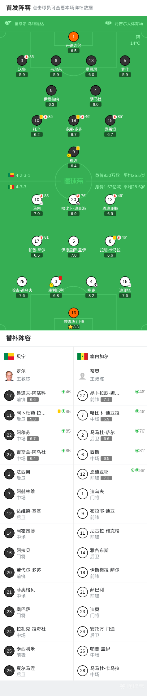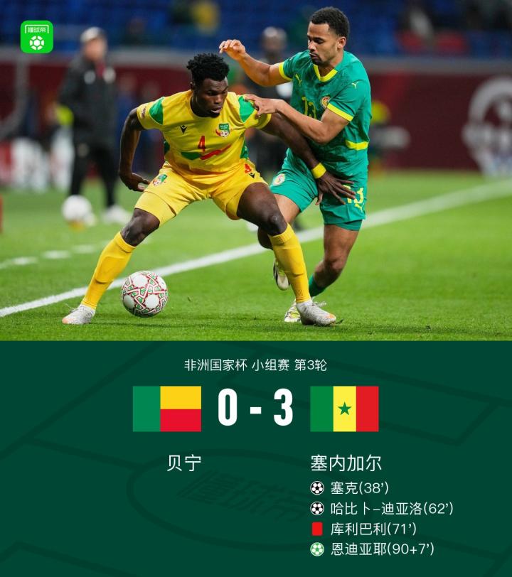 北京时间12月31日,非洲杯小组赛第3轮,贝宁对阵塞内加尔。比赛中,塞克头槌首开记录,马内助攻哈比卜-迪亚洛破门,库利巴利染红。临近结束,恩迪亚耶主罚点球命中。最终,塞内加尔3-0完胜贝宁,以小组头名出线。