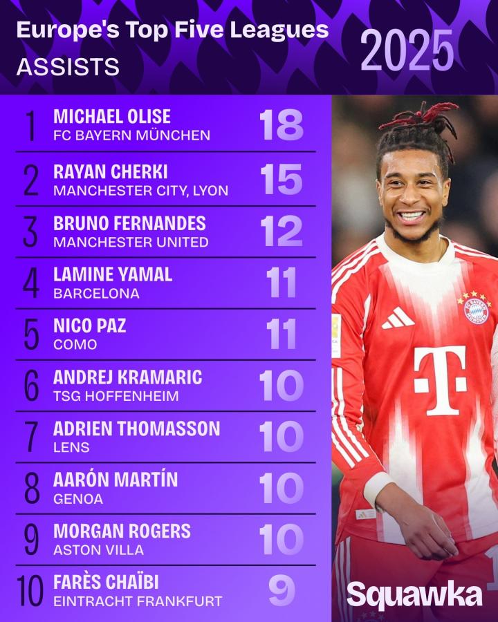 扫描下载懂球帝首页>动态> 2025年五大联赛助攻榜:奥利塞18次居首,谢尔基15次位列第二
