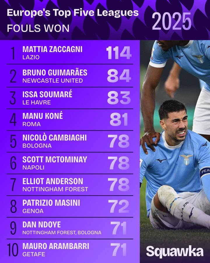扫描下载懂球帝首页>动态> 2025五大联赛被犯规榜:拉齐奥前锋扎卡尼114次,吉马良斯第二