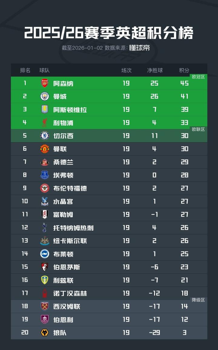 扫描下载懂球帝首页>动态> 英超半程积分榜:曼城被逼平后,阿森纳领先优势增至4分