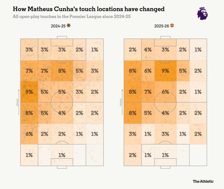 现在来说说更令人困惑的地方。库尼亚已经适应了老特拉福德,但曼联在适应他方面仍存在问题。库尼亚在传球选择上的习惯,与他上赛季在狼队时有着明显相似之处,但他与中锋之间的配合方式发生了变化。此前,库尼亚更习惯与一名长期驻守中路、牵制对方中卫、并能通过回做球帮助他前插的前锋合作。但在曼联,这种模式较难复制,因为伤病、疾病以及战术实验限制了谢什科的出场时间。