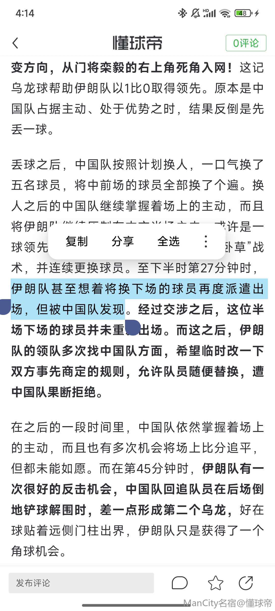 ③乌龙丢球 下半时占优势
