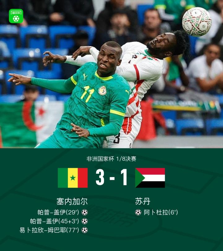 北京时间1月4日,非洲杯1/8决赛,塞内加尔对阵苏丹。比赛中,阿卜杜拉兜射世界波闪击,随后帕普-盖伊梅开二度,易卜拉欣-姆巴耶建功,马内助攻双响。最终,塞内加尔3-1逆转苏丹,晋级非洲杯8强。