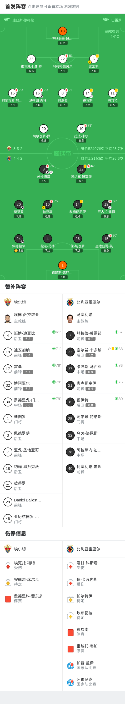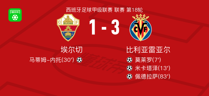 北京时间1月4日西班牙足球甲级联赛 联赛 第18轮,埃尔切主场对阵比利亚雷亚尔。埃尔切马蒂姆-内托破门。比利亚雷亚尔莫莱罗破门,米卡塔泽破门,佩德拉萨破门。最终比分埃尔切 1-3 比利亚雷亚尔。