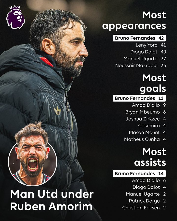 扫描下载懂球帝首页>动态> 阿莫林执教期间,B费是曼联英超出场、进球、助攻最多的球员