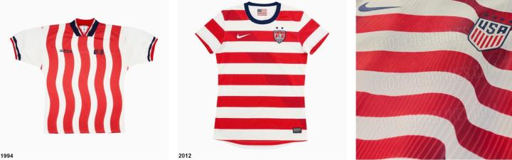 该设计明显致敬了美国国旗元素,同时也让人联想到1994年美国世界杯球衣以及2012年美国队主场球衣,在传承与创新之间取得平衡。美国国旗旗面的经典设计由13道红白相间的宽条构成,13条间纹象征着美国最早建国时的13个殖民地。因此这一红色条纹设计也被广泛运用于美国各运动代表队的球衣设计之中。