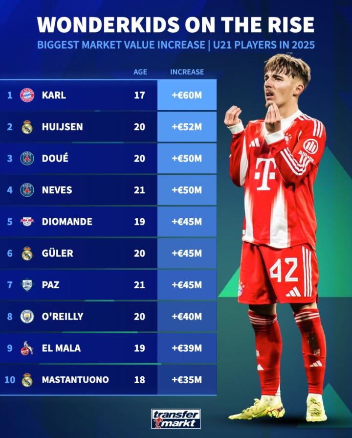 扫描下载懂球帝首页>动态> 德转列U21球员2025年身价涨幅榜:卡尔、赫伊森、杜埃前三