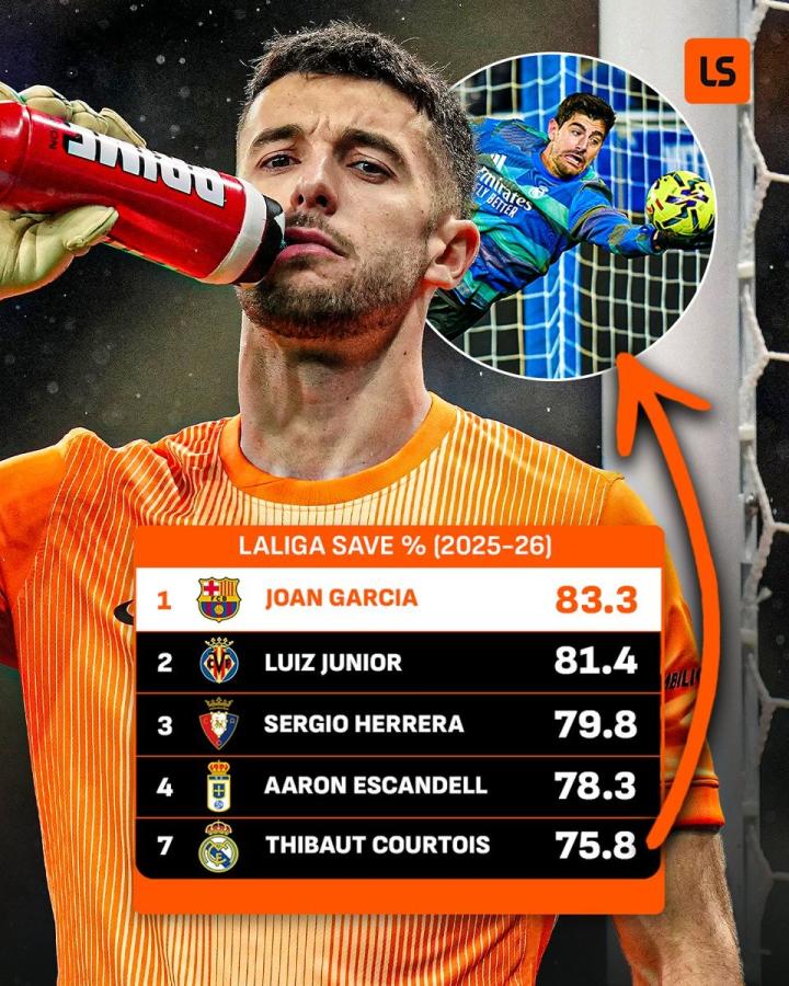 扫描下载懂球帝首页>动态> 本赛季西甲扑救成功率榜:霍安-加西亚榜首,库尔图瓦第7